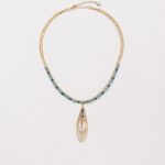 Floris est un modèle de collier double rang léger et élégant, constitué d’une fine chaîne dorée faisant ressortir le deuxième rang composé de somptueuses pierres minérales : cercles de Jade teintés facettés couleur bleu canard et des rectangles de Cristaux facettés aux angles, permettant de mettre en valeur le pendentif constitué d’une légère goutte en filigrane embellie par des pierres minérales : cercles de Jade teintés facettés, rectangles de Cristaux facettés aux angles et un petit coquillage.