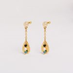 Fines et élégantes, les boucles d’oreilles Handy sont composées de légères gouttes martelées, embellies par de somptueuses pierres minérales : Agates noires, Howlites blanches et perles de Jade teintées bleu canard.