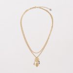 Chic et simple, Jade est un collier double rangs composé de deux fines chaînes dorées, mettant en valeur le pendentif constitué d’une feuille en filigrane, d’un triangle et d’une rosace en filigrane embellie par de délicates pierres minérales facettées : Grenats et Agates noires.